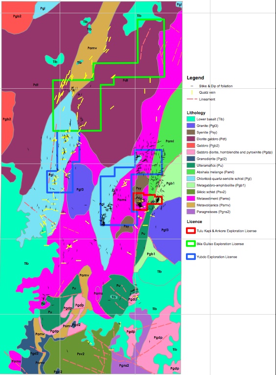 The Tulu Kapi region has typical greenstone type geology which is characterized by prominent hills of intrusive rocks and deeply incised valleys containing metasediments and metavolcanic rocks.