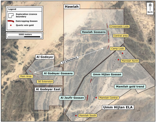 The recently granted Umm Hijlan EL adjoins the original Hawiah EL consolidates a 210km2 strategic licence area for GMCO and offers the prospect of adding significant additional oxide and sulphide resources. The Umm Hijlan EL has already been demonstrated to contain the southern strike continuation of the main Hawiah VMS system. The strike length of known gossans on the Umm Hijlan EL is similar to the length of gossans on the Hawiah EL.