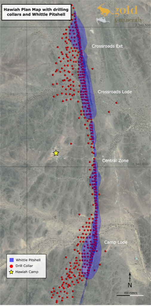 The Hawiah orebody comprises a continuous subvertical tabular layer for approximately 4.5km along north to south strike at outcrop. Localised minor pinch outs occur, which are not significant. Two major zones (lodes) of down-dip extent have been defined (the Camp Lode in the south and the Crossroads Lode in the north) which plunge approximately 25° to the south for 1.7km (Camp) and 1.8km (Crossroads) to approximately 740m vertical depth below surface.